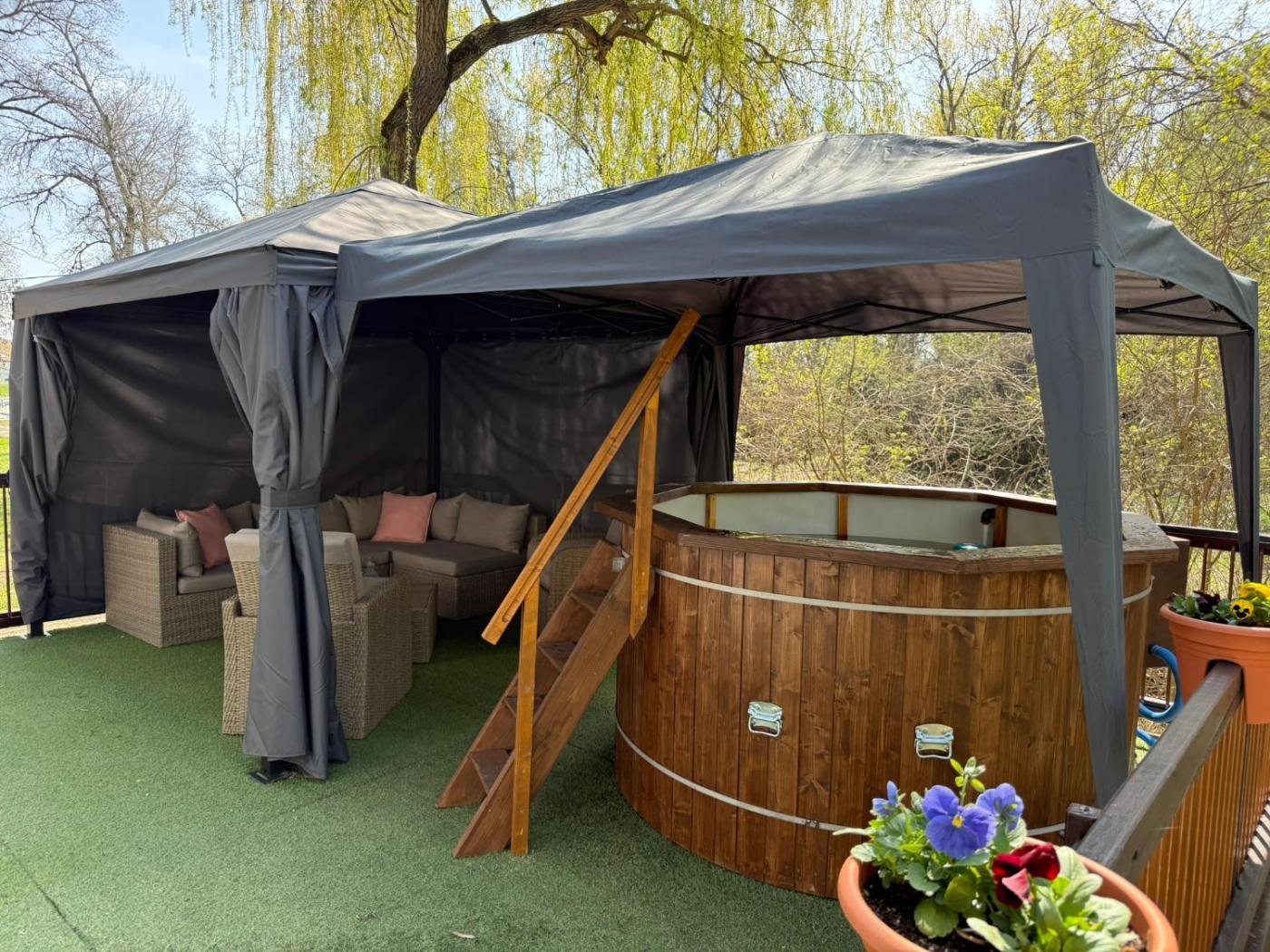 Két hálószobás apartman. The hot tub and fireplace are the standout features of this apartment. Featuring a private entrance, this air-conditioned apartment comprises 1 living room, 2 separate bedrooms and 1 bathroom with a shower and a hairdryer. Guests will find a stovetop, a refrigerator, kitchenware and a microwave in the well-equipped kitchen. The apartment also provides guests with a barbecue. Boasting a terrace with garden views, this apartment also provides soundproof walls and a flat-screen TV with streaming services. The unit offers 3 beds.